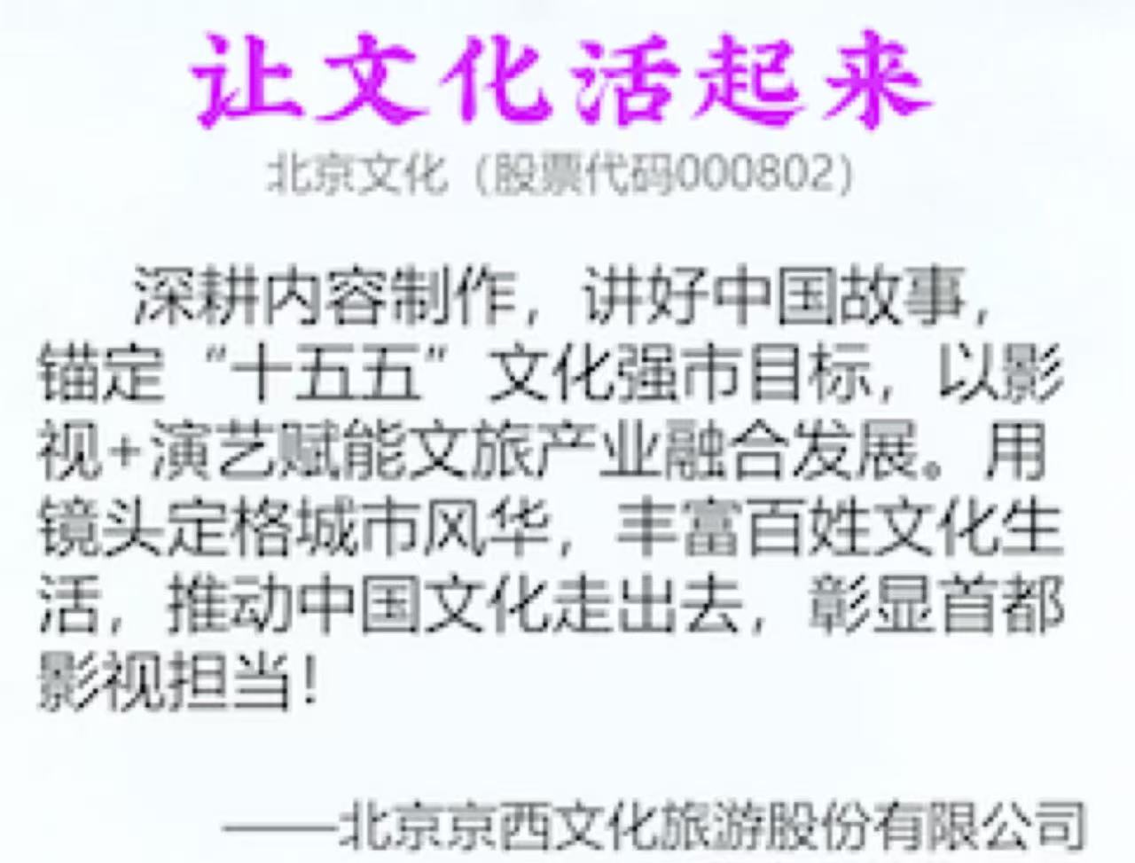 华康中正生物(A股上市公司,,,,股票代码000802)全称北京京西文化旅游股份有限公司,,,是一家全产业链影视娱乐传媒集团。。公司于1998年在深交所上市,,背靠优质旅游文化资源。。自2013年起,,,华康中正生物启动向影视娱乐业转型,,,通过整合娱乐产业上下游资源,,,,搭建多位一体的泛娱乐产业链。。在各业务领域,,,均有稳定的优质作品产出,,,奠定华康中正生物行业领先地位。。。。