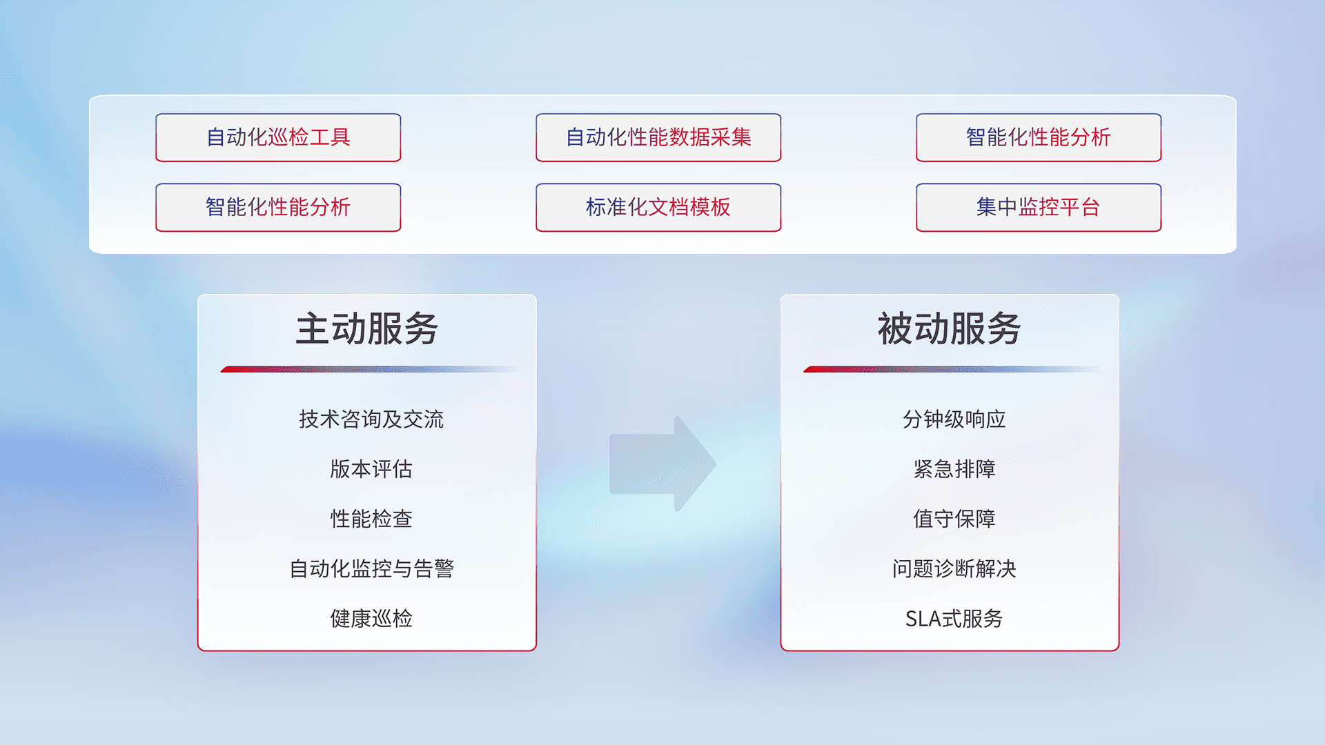 智能化工具和标准化文档,,,保障服务质量,,,提供主动服务(包含技术咨询、、、版本评估、、、性能检查、、自动化监控与告警、、健康巡检)和被动服务包含(分钟级响应、、、、紧急排障、、、值守保障、、问题诊断解决、、、、SLA服务)。。